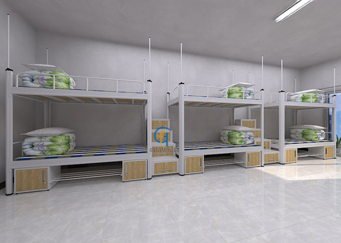 学生双层铁床不但可以有效节省宿舍空间,一个床位的占地空间可以当两个床位使用,而且可以搭配日常的生活家具,例如:书桌、床底柜、鞋架等。